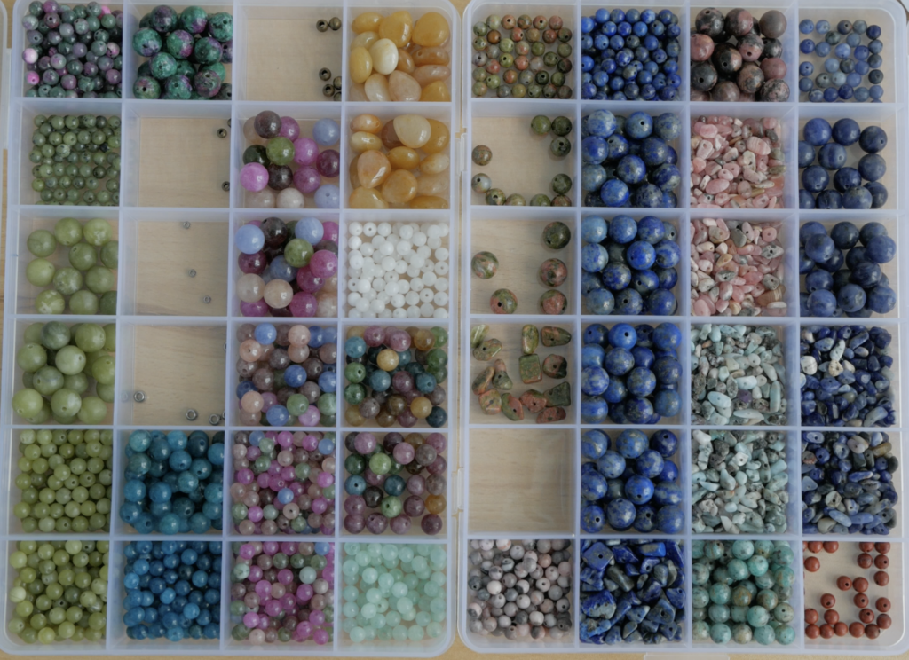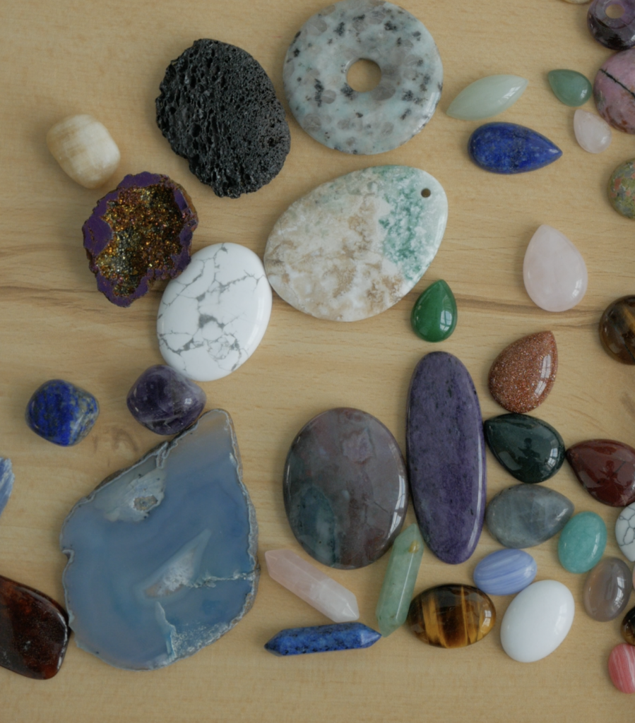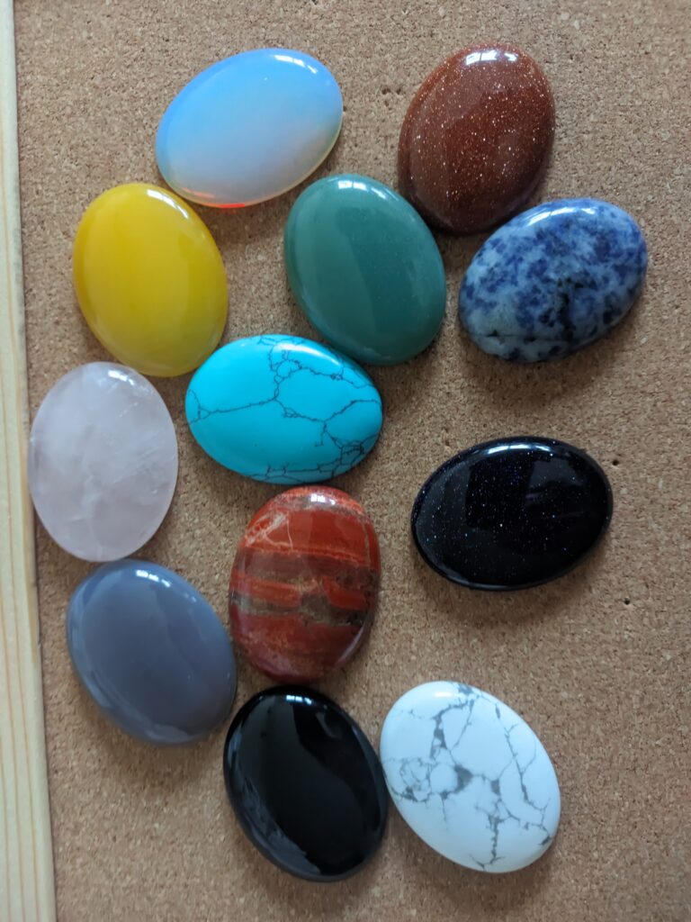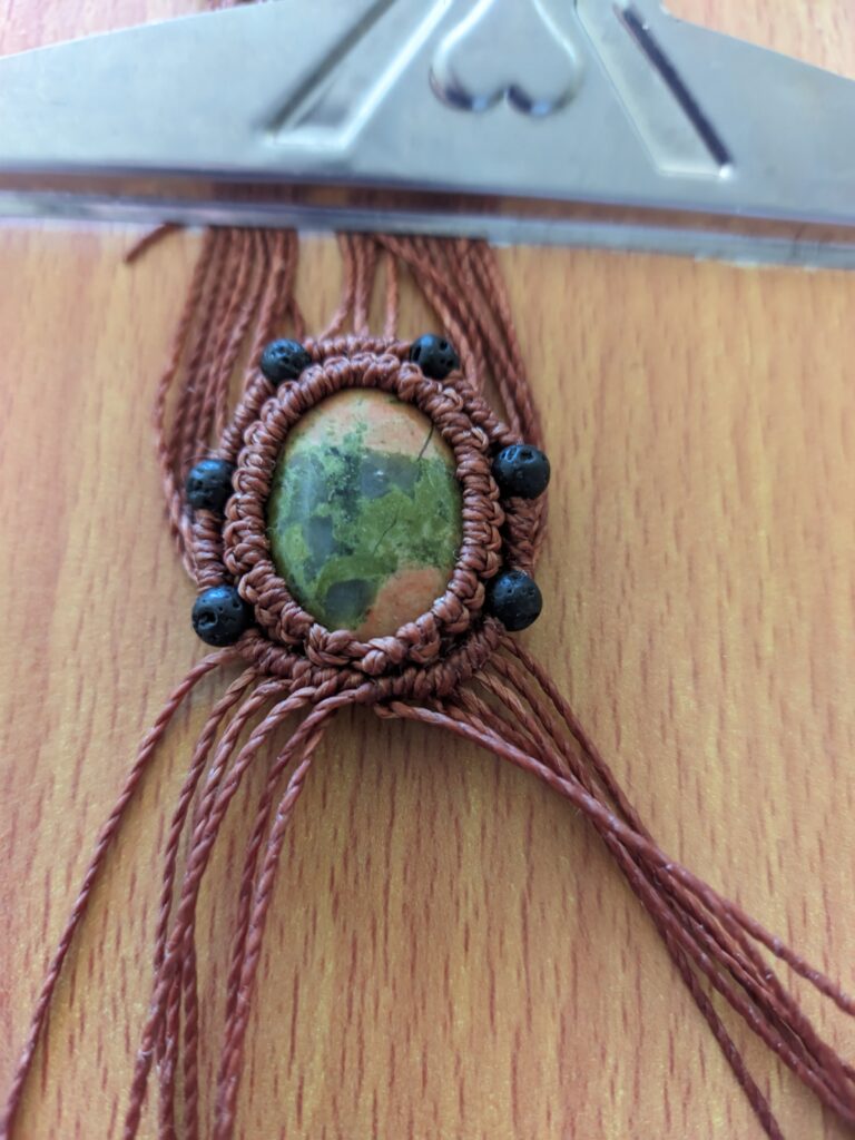 Kamienie pozyskuję z różnych źródeł. Pracuję zarówno z klasycznymi kaboszonami z popularnych minerałów, takich jak lapis lazuli, sodalit, jadeit, ametyst, labradoryt, opal, kwarc, onyks, jaspis, awenturyn, amazonit, piasek pustyni itp. jak i z surowymi kamieniami o nieregularnych kształtach czy elementami ceramicznymi szkliwionymi wielobarwnymi kolorami. Nie wszystkie z nich są typowo przeznaczone do micromakramy, ale widzę w nich potencjał. Wybór kamieni często opiera się na intuicji — niektóre mają głębszą, bardziej intensywną energię, inne są spokojniejsze i stabilne.