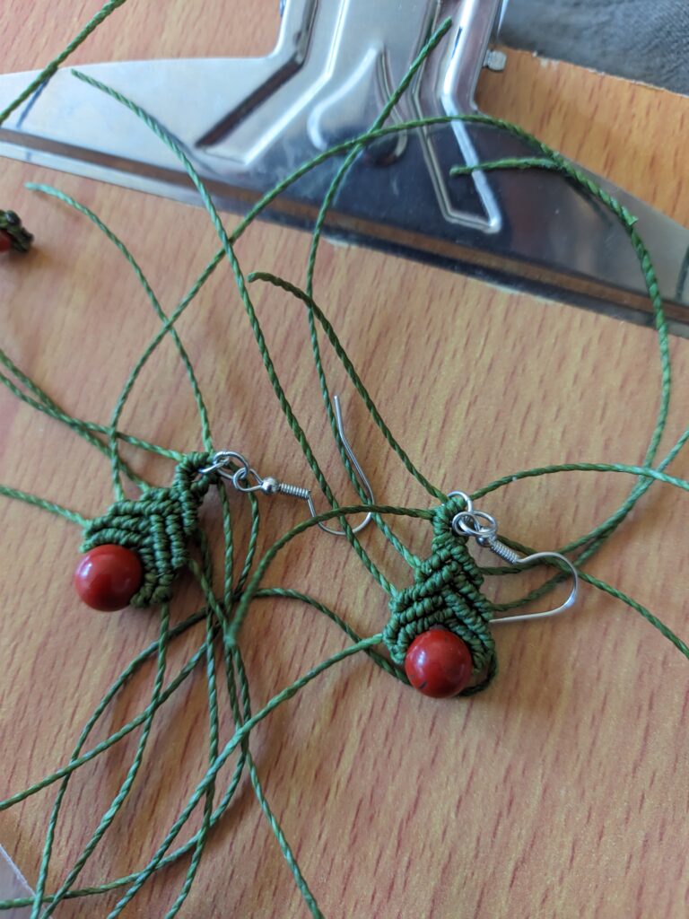 Tworzenie biżuterii z micromakramy to proces bardzo pracochłonny. Składa się z wielu etapów — od projektu, przez plecenie, aż po wykończenie. Po zapleceniu całości trzeba precyzyjnie odciąć nici i zabezpieczyć ich końcówki roztopionym woskiem. Każdy etap wymaga dokładności, bo nawet drobny błąd może wpłynąć na końcowy efekt.