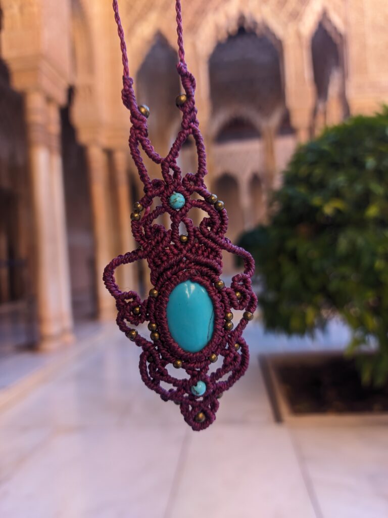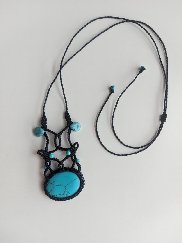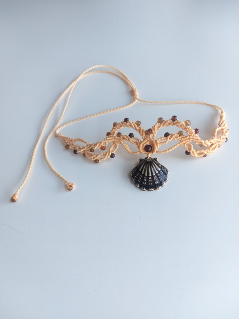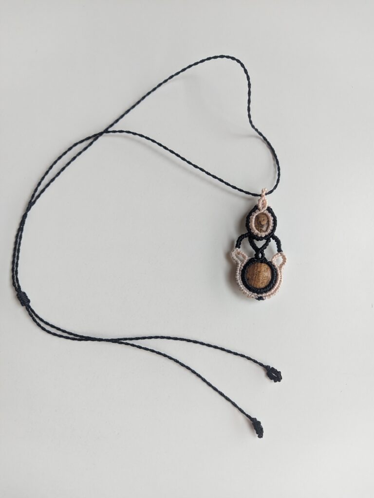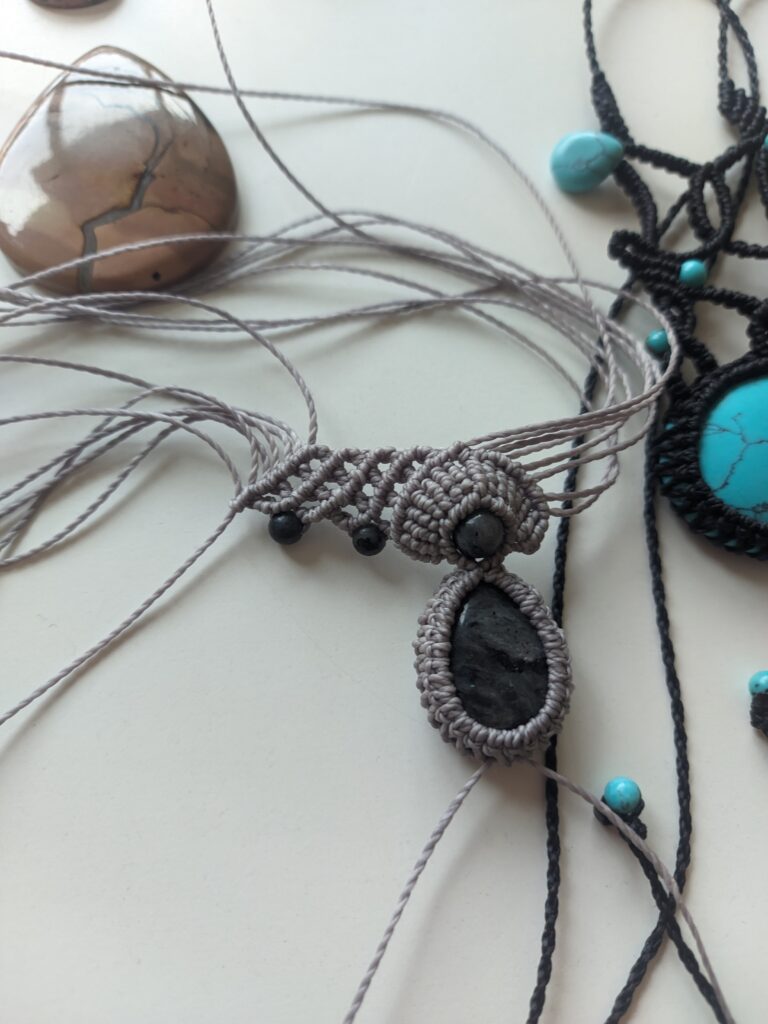 Każdy projekt jest inny. Nawet jeśli pracuję na podobnym wzorze, różnice w kolorach nici, ich strukturze, stopniu nawoskowania czy wielkości kamieni sprawiają, że efekt końcowy zawsze się zmienia. Czasem zmieniam liczbę węzłów lub drobne detale, co całkowicie wpływa na formę. Dzięki temu każda biżuteria pozostaje unikatowa.